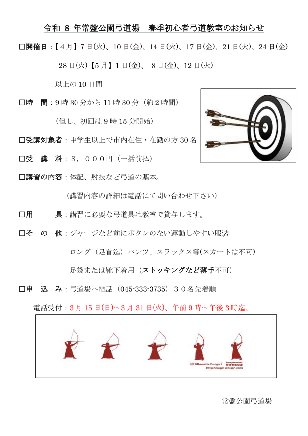 横浜市常盤公園弓道場初心者弓道教室(春・秋2回実施)令和8年春季初心者弓道教室令和8年秋季初心者弓道教室